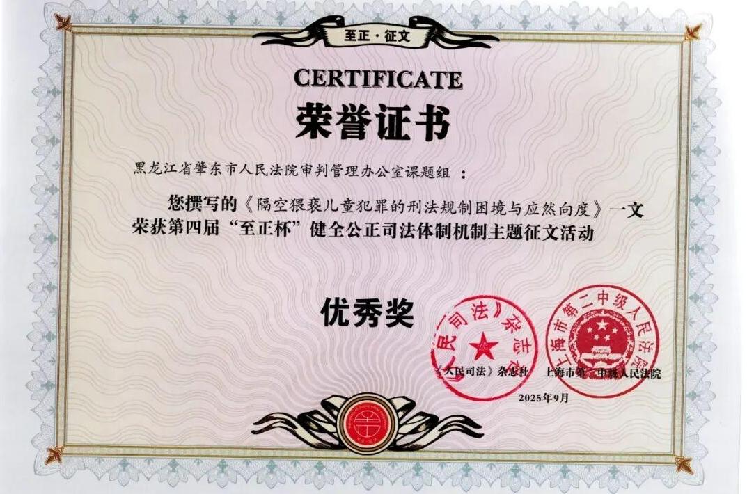 肇東市人民法院1篇論文在人民司法“至正杯”征文活動中獲獎
