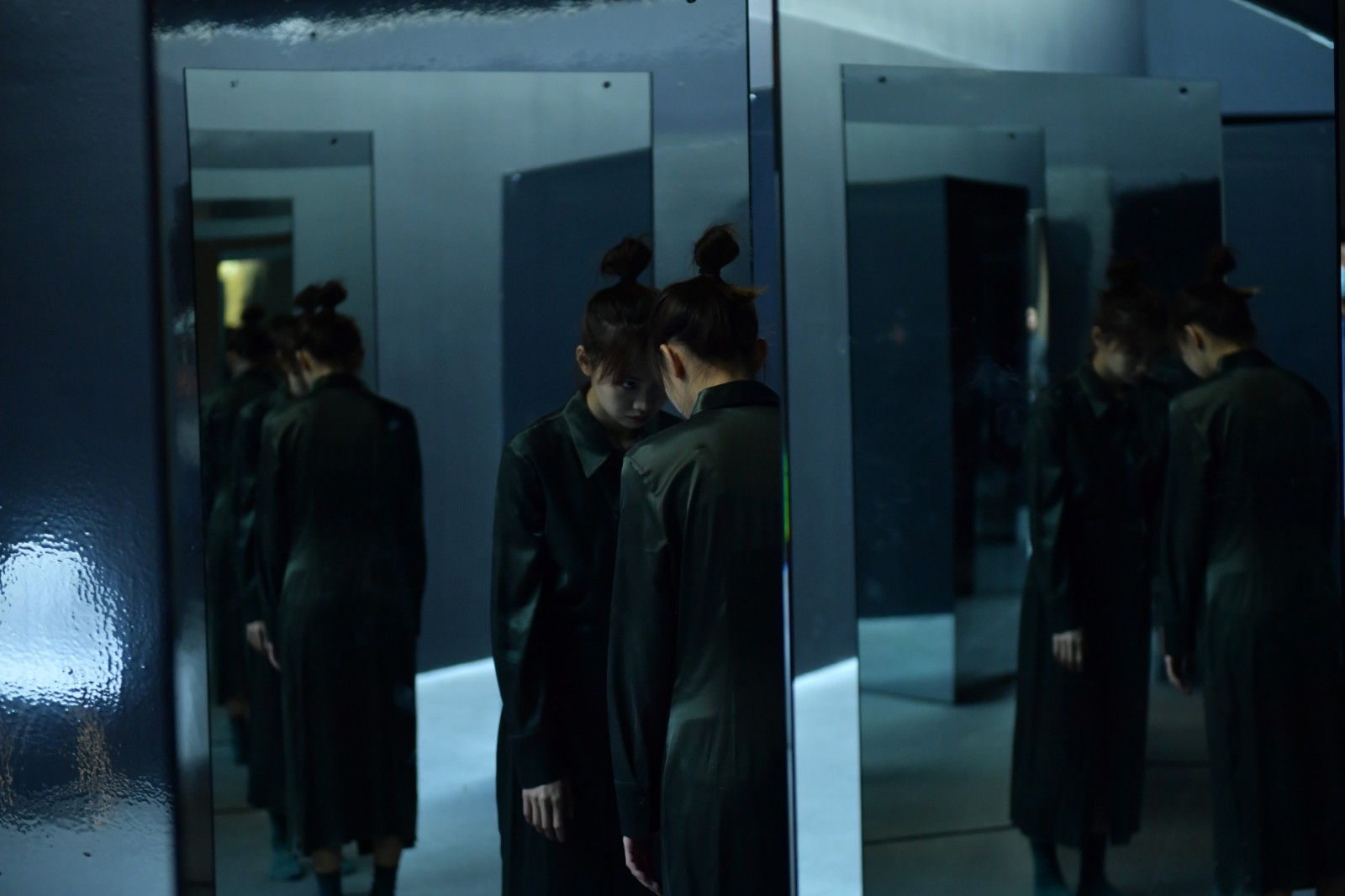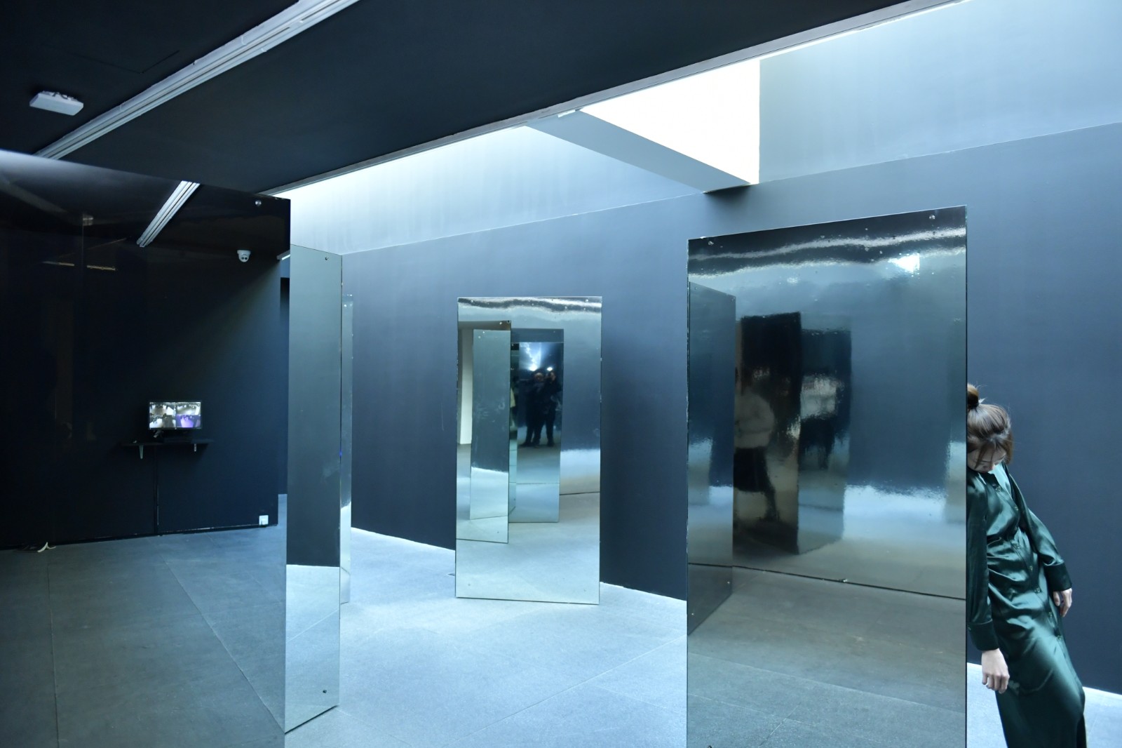 在OCAT研究中心展廳最明亮而寬闊的長走廊上,紙老虎工作室借助六個鏡面反射的三棱柱營造了一個劇場式的空間,邀請觀眾進入并參與到劇目的演繹與發(fā)展中來。鏡面反射著“我”和周圍的環(huán)境,清晰地呈現(xiàn)著“我”在環(huán)境中的位置。