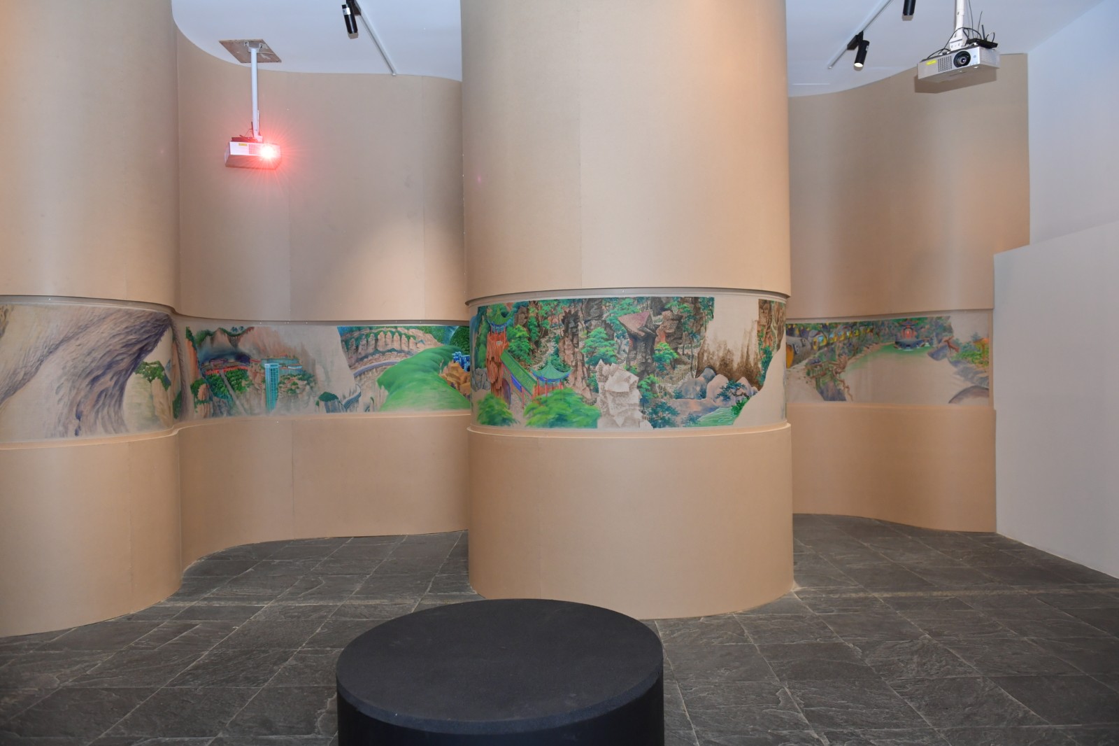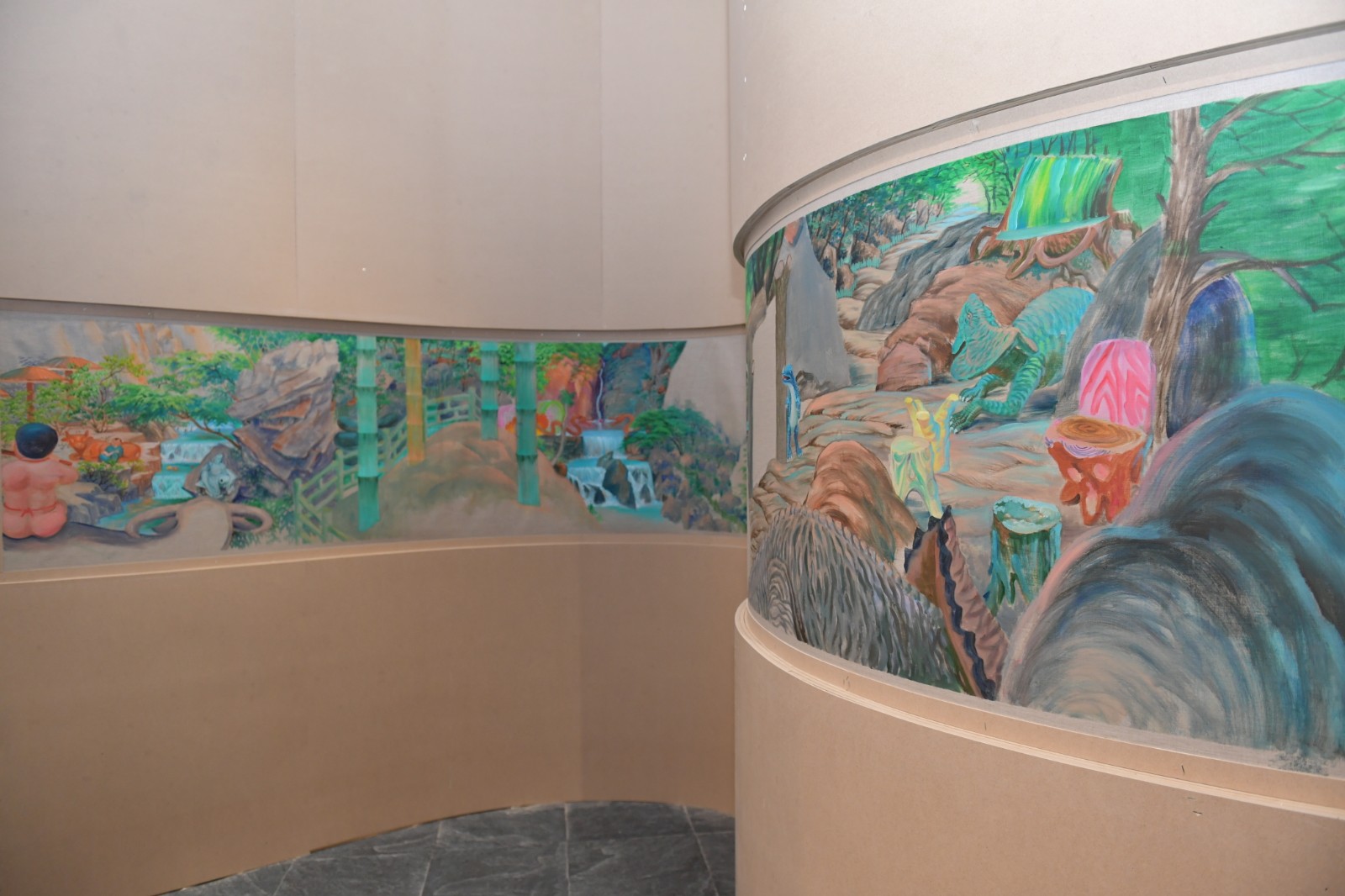 “地洞”一旁是展廳的下沉區(qū)域,這里被策展人設計為去往“桃花源”的實體路徑。梁碩的《景了個區(qū)》出現(xiàn)在這個下沉空間的一排四個口袋式的連續(xù)隔間墻面上,從空間上來說是無比契合的?;仡櫫捍T2019年在北京公社的展覽《梁碩:景區(qū)》同樣可以見到這樣一種迂回的觀展路徑?!熬皡^(qū)”這個概念的提出,在藝術家看來代表著今天人們對山水的理解,這個獨特的概念跨越了自然景觀與都市空間。梁碩在自己撰文的《景了個區(qū)》中復原了一個景區(qū)籌備建立起來的小故事,承包景區(qū)改造的劉工在工期接近尾聲時,看到自己的“杰作”時不由感嘆:“這些水泥造物,居然都妥妥的在那了,像是本來就是從山里長出來的,那巨大的假山石和假樹根顯得造型怪異,卻頗得陳老蓮氣韻,在落日的余暉中與真山融為一體,真山也像了假山……”[6]景區(qū)的建立勢必意味著人工、商業(yè)、消費對自然景觀的直接侵入與改造,空間、審美、意識形態(tài)等一系列問題由此發(fā)生。