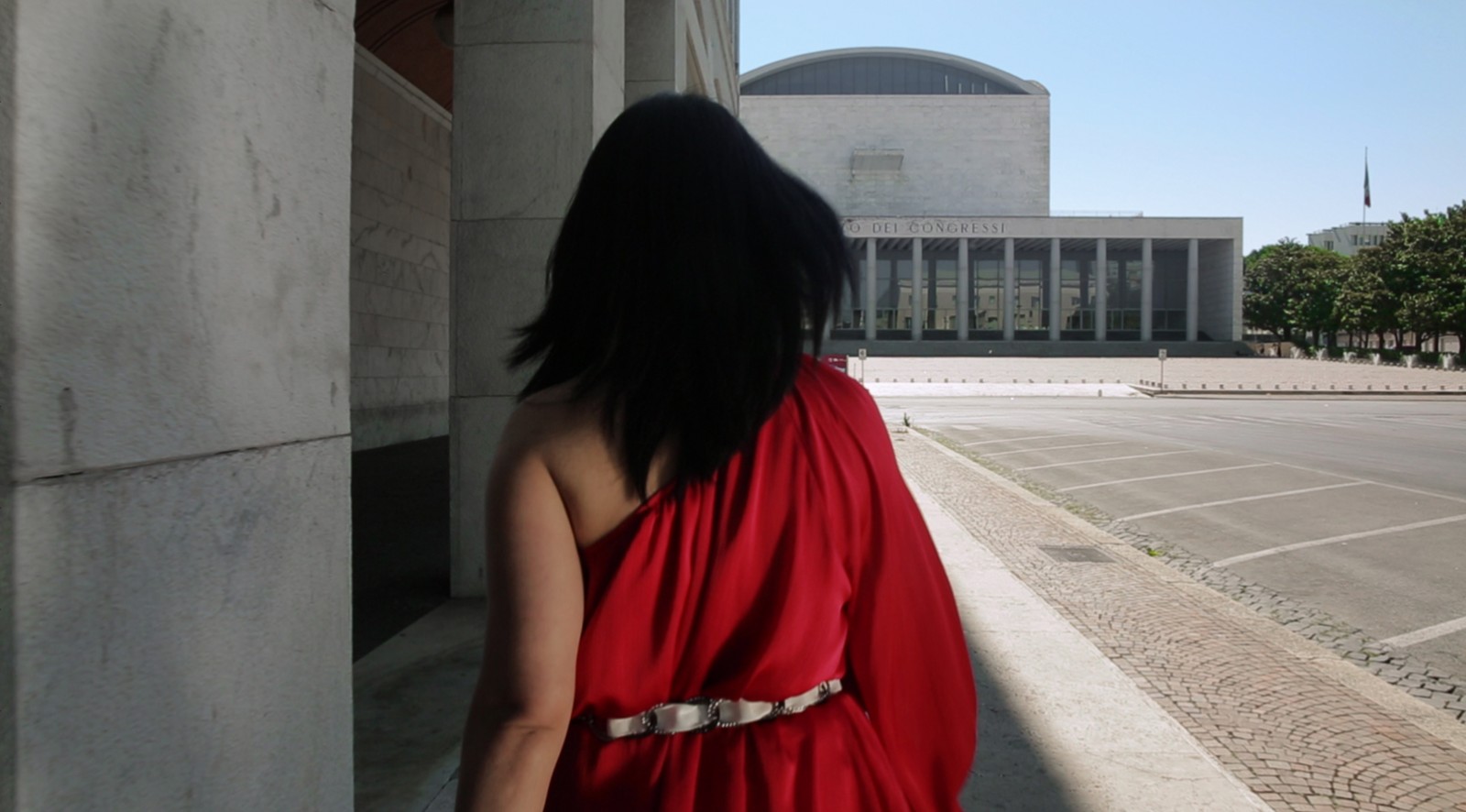 梅·海瑟格(Maj Hasager)《我們將在盲點相遇》是展覽呈現(xiàn)的最后一件作品,其講述了關于羅馬新城EUR區(qū)(Esposizione Universale di Roma)里的菲律賓移民的故事。這座由墨索里尼親自監(jiān)督設計的,以法西斯美學構想出來的烏托邦城市,直至1960年才建成并被逐步被開發(fā)為羅馬新的富人區(qū)。海瑟格把眾多意大利導演在EUR區(qū)攝制的紀錄片、電影所刻畫的城市公共記憶,與這群定期在市中心一座教堂的地下室聚會的移民社群一同放入她的影像作品中,影像記錄了這個群體的閑暇時光,以一種個人的、私密的視角探索了菲律賓移民的私人記憶與生活如何融入并生存于這座有著強大歷史記憶的城市之中。正如約翰·伯格(John Berger)在《第七人》中的論述:“兩群不同的人在任何情況下,永遠都是共性大于差異性的。只是由于種種原因,環(huán)境蒙蔽了人們的眼睛?!盵7]我們看得見的是歷史的記憶碾壓而過留下的軋痕以及其帶來的城市變遷,而看不見的是居于其中的人是如何在此種變遷中安放自我的記憶與故事。從這個立意來看,展覽所討論的議題似乎又回溯到了“公共”與“私人”,“歷史”與“記憶”之間的連接,然而涉及的場域已經擴展到了一個城市或是一種文化以外。