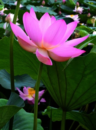 荷葉蓋很大,呈圓盾形,邊緣起伏如波狀隨風(fēng)搖擺,姿態(tài)很優(yōu)美。從各個(gè)角度可以看到葉蓋正、側(cè)、反、卷、垂的狀態(tài)。葉蓋的葉脈俗稱(chēng)葉筋,從葉蓋的臍眼向四周放射性伸展,極有規(guī)律。