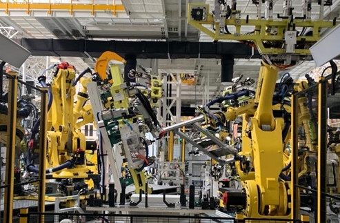 資料圖:江西上饒一家新能源電動汽車公司的智慧工廠內(nèi),機器人正同時作業(yè)。 李韻涵 攝
