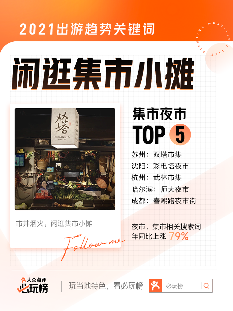 “市井煙火氣,最撫凡人心”,夜市、集市拓寬游客游玩半徑,為深度探索城市提供了更多可能。據(jù)“必玩榜”數(shù)據(jù)顯示,夜市、集市相關(guān)搜索詞年同比上漲79%,其中哈爾濱的師大夜市與蘇州的雙塔市集、沈陽的彩電塔夜市、杭州的武林市集、成都的春熙路夜市街共同入選全國TOP5熱門集市夜市。