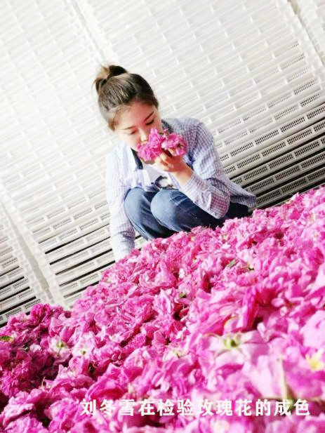 今年32歲的劉冬雪,從小就看著外公王占龍帶領(lǐng)父親及家人試種玫瑰花,剛開始種植品種單一,種植面積小,玫瑰產(chǎn)量低。2009年,正在讀高中的劉冬雪,在外公和父親的影響下,加入到玫瑰花種植工作中,幫助老輩管理生產(chǎn)、銷路、產(chǎn)品創(chuàng)新等多個環(huán)節(jié)。劉冬雪有文化、肯專研,女孩子對玫瑰花更是情有獨鐘,父輩一商量將合作社經(jīng)理的重?fù)?dān)就交給了她。劉冬雪深知近年隨著玫瑰面積和產(chǎn)量的不斷提高,他們還是家庭小作坊模式,“單打獨斗”地跑市場,只能是小打小鬧。為此,她跑市場、找銷路、先后到云南、山東等地考察,了解鮮花生產(chǎn)和銷售。并函授學(xué)習(xí)了林農(nóng)大專課程,不斷更新鮮花品種,提升鮮花品質(zhì),逐步打開了鮮花銷路。劉冬雪也深入思考,只賣原材料經(jīng)受不了市場的考驗,她夢想建一個玫瑰花深加工企業(yè),但是,因缺少資金遲遲沒有實現(xiàn)心中的愿望。