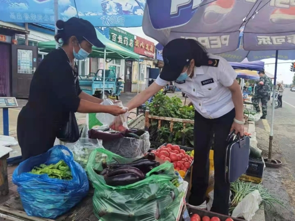 執(zhí)法人員現(xiàn)場發(fā)放《黑河市市場監(jiān)督管理局食品安全“你點我檢”調(diào)研問卷》46份,并根據(jù)調(diào)研問卷統(tǒng)計結(jié)果隨機抽取大集上售賣的熟食、水果、蔬菜等樣品。