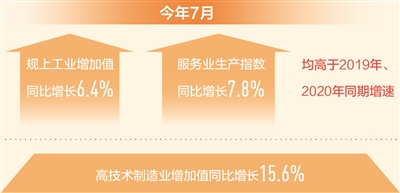 工業(yè)、服務(wù)業(yè)穩(wěn)步增長(zhǎng)。7月,全國(guó)規(guī)模以上工業(yè)增加值同比增長(zhǎng)6.4%,全國(guó)服務(wù)業(yè)生產(chǎn)指數(shù)同比增長(zhǎng)7.8%,均高于2019年、2020年同期增速;中國(guó)制造業(yè)采購(gòu)經(jīng)理指數(shù)為50.4%,服務(wù)業(yè)商務(wù)活動(dòng)指數(shù)為52.5%,均連續(xù)17個(gè)月高于臨界點(diǎn);服務(wù)業(yè)業(yè)務(wù)活動(dòng)預(yù)期指數(shù)為60.1%,持續(xù)位于較高景氣區(qū)間。