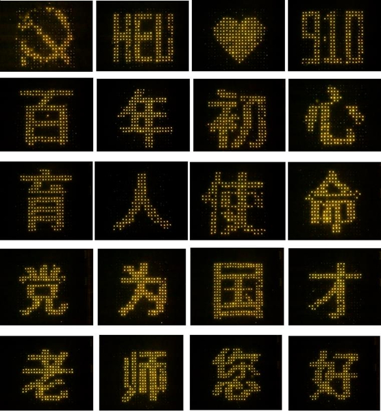 黨徽、HEU(哈工程縮寫)、愛心、9.10、百年初心、育人使命、為黨育人、為國育才、老師您好……同學們匯聚力量共同拼出了24組圖案和字樣,即使天空飄起毛毛細雨,他們也絲毫沒有變換位置,在雨中足足站了兩個小時。2021級博士生王文軒感慨:“作為一名本、碩都就讀于哈工程的學生,這所大學的老師教會了我如何做人做事做學問,我們用這場燈光秀,獻禮我們最尊敬的老師,我們也一定會傳承哈軍工精神,勇?lián)鷱妵倌晔姑鼡敗!?/span>