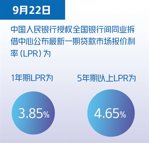 9月22日,中國人民銀行授權全國銀行間同業(yè)拆借中心公布最新一期貸款市場報價利率(LPR)為:1年期LPR為3.85%,5年期以上LPR為4.65%。兩項貸款市場報價利率均連續(xù)18個月保持這一水平。