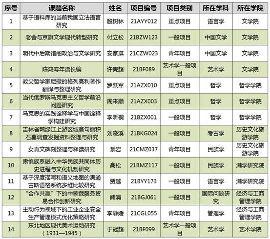 據(jù)了解,國家社會科學(xué)基金項目是經(jīng)國務(wù)院批準(zhǔn)設(shè)立,由全國哲學(xué)社會科學(xué)工作辦公室負(fù)責(zé)管理,人文社科研究領(lǐng)域中層次最高、資助力度最大、權(quán)威性最強的國家級項目,受到學(xué)界高度關(guān)注。今年黑龍江大學(xué)立項的項目總體上有以下幾個特點:一是傳統(tǒng)優(yōu)勢學(xué)科立項數(shù)量穩(wěn)定增長。中國語言文學(xué)獲得4項,哲學(xué)獲得3項,與去年比較穩(wěn)中有升,保持了良好的科研發(fā)展態(tài)勢。二是特色學(xué)科亮點突出。考古學(xué)、民族學(xué)、國際問題研究、管理學(xué)等學(xué)科善于抓住熱點和難點問題,歷年均有斬獲;藝術(shù)學(xué)獲得2項一般項目,立項數(shù)居全省第一位,實現(xiàn)歷史性突破。三是高層次項目數(shù)量全省領(lǐng)先。全省共獲重點項目4項,黑大獲得其中3項,立項數(shù)占全省總量的75%。國家社科基金重點項目主要資助學(xué)術(shù)分量厚重、創(chuàng)新性強、對學(xué)科發(fā)展具有重要推動作用的研究成果。重點項目數(shù)量僅為每年立項總數(shù)的8%左右,是衡量科研單位科研能力和水平的重要標(biāo)志,在各類評估、評比中具有較大權(quán)重。四是青年項目占比提高。從項目層次分布上來看,獲3項青年項目,占立項總數(shù)的21.4%,居十年來最高水平。