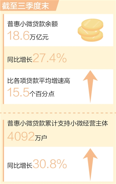 中國人民銀行發(fā)布的最新數(shù)據(jù)顯示,截至三季度末,我國普惠小微貸款余額18.6萬億元,同比增長(zhǎng)27.4%,比各項(xiàng)貸款平均增速高15.5個(gè)百分點(diǎn)。普惠小微貸款維持較高的增長(zhǎng)態(tài)勢(shì),繼續(xù)保持量增、面擴(kuò)、價(jià)降、結(jié)構(gòu)優(yōu)化的特點(diǎn)。