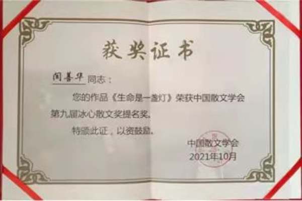 在幾十年的文學(xué)創(chuàng)作和編輯工作中,她不斷堅(jiān)持學(xué)習(xí)提高,筆耕不輟,執(zhí)著堅(jiān)守。在2020年10月發(fā)表在《北極光》上的散文《生命是一盞燈》,因主題對(duì)生命的感悟,用縱橫寬泛的思路、真摯的情感,流暢的文筆,經(jīng)評(píng)委嚴(yán)格評(píng)審,最終脫穎而出,獲得本屆冰心散文獎(jiǎng)單篇提名獎(jiǎng)。這對(duì)于一直深居邊陲縣城的一名作家,能邁進(jìn)冰心散文獎(jiǎng)這中國(guó)散文最高獎(jiǎng)的大門,是一個(gè)非常難得的殊榮。
