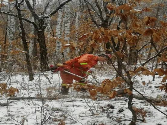 在經(jīng)過(guò)一段緊張嚴(yán)格的產(chǎn)前技能及安全培訓(xùn)后,紅星林場(chǎng)職工們備齊生產(chǎn)工具和防護(hù)物品,每天頂著未褪盡的夜色出發(fā),天剛冒亮就開工,在積雪覆蓋的林間不停穿行,鋸手手持割灌機(jī)把作業(yè)規(guī)程要求的各類林內(nèi)枯死、風(fēng)折枝干伐除,后面的歸堆工緊隨其后,把割下的枯干枝條有序的理順碼成堆。各小組分工明確,配合嫻熟,漫山雜亂的倒木藤條在工人們的手下被梳理的清晰利落,寂靜的山林也在機(jī)器的轟鳴和工人們的笑聲中熱鬧起來(lái)。