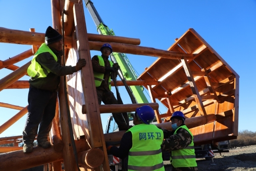 阿木爾林業(yè)局環(huán)衛(wèi)隊(duì)黨員干部職工正在安裝薩布素軍馬場(chǎng)大門(mén)(王力 攝)