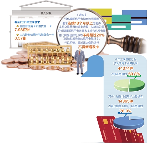 近年來,我國銀行業(yè)金融機(jī)構(gòu)信用卡業(yè)務(wù)快速發(fā)展,在便利群眾支付和日常消費(fèi)等方面發(fā)揮了重要作用。人民銀行發(fā)布的數(shù)據(jù)顯示,截至2021年三季度末,全國有信用卡和借貸合一卡7.98億張,人均持有信用卡和借貸合一卡0.57張。發(fā)卡量激增的同時,行業(yè)亂象也被各界詬病,尤其是消費(fèi)者針對信用卡過度營銷、亂收費(fèi)等問題的投訴量近年來居高不下。