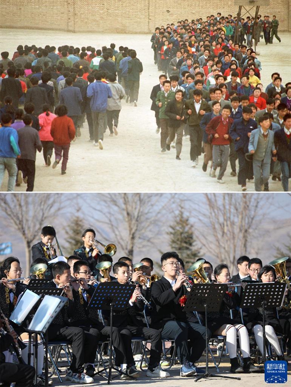 拼版照片:上圖為2001年,會(huì)寧縣二中學(xué)生跑步鍛煉身體(新華社記者 武斌 攝);下圖為2022年1月19日,會(huì)寧縣會(huì)師中學(xué)交響管樂團(tuán)學(xué)生在戶外表演交響樂(新華社記者 馬希平 攝)。