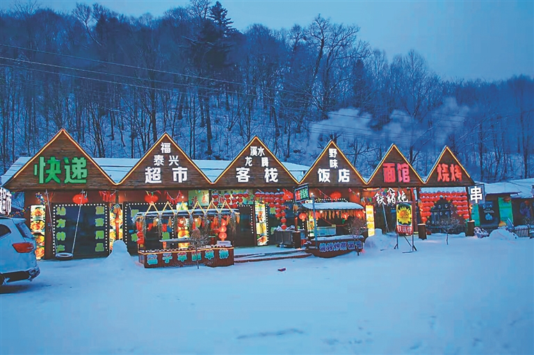 當(dāng)我們抵達(dá)雪谷的時(shí)候,暮色已濃,天地間覆蓋了一片黑色的幕布。但雪谷中心街道上,聳立著由上千只大紅燈籠排列組合的拱形門,燈火輝煌,延續(xù)百米開外。門的頂端中央鑲嵌著“中國(guó)雪谷”四個(gè)金色大字,格外醒目。我們停下車拍照,并就近住宿,溫暖的火炕讓我們很快進(jìn)入夢(mèng)鄉(xiāng)。