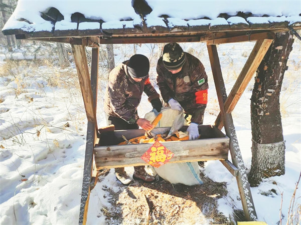同一時(shí)間,青山林場(chǎng)的巡護(hù)隊(duì)員來(lái)到53林班補(bǔ)飼點(diǎn),貼福字,送“年貨”。“這過(guò)年了,狍子野豬的食物也得提檔升級(jí)。咱們過(guò)年吃餃子,它們也得吃點(diǎn)好的?!标?duì)員王振林邊擺放著玉米、豆餅粉、白菜、蘿卜等食物邊調(diào)侃著。