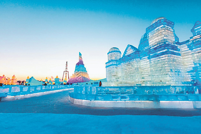 雪是潔白無(wú)瑕的,冰是晶瑩剔透的。在世界最大冰雪主題樂(lè)園——哈爾濱冰雪大世界,冰雪可以是五彩斑斕的。這些取材于松花江面的大冰塊,在白天展現(xiàn)了冰與雪的極致浪漫,宏偉的冰體建筑晶瑩剔透,雪雕作品潔白如玉。待到夜幕降臨,周?chē)届坏臒艄饬疗?,七彩琉璃閃耀著璀璨的光芒,照亮了冰城上空。