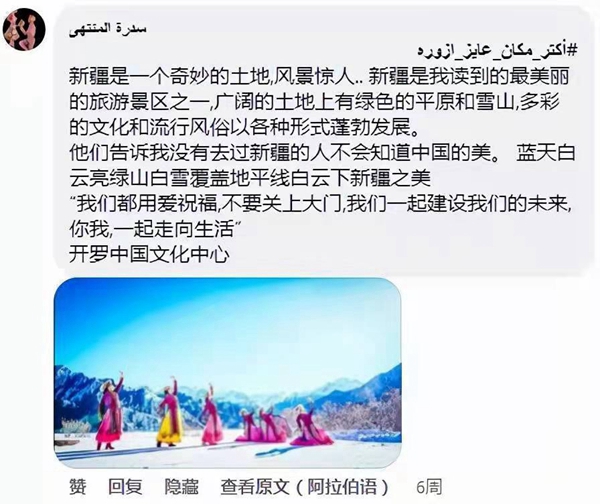 其中,來(lái)自埃及曼蘇拉的西德拉·蒙塔哈獲得本次活動(dòng)的“最佳評(píng)論獎(jiǎng)”。她在中心帖文下多次留言,“新疆風(fēng)景迷人,是最美的旅游勝地之一。在廣袤的土地上有草原和雪山,沒(méi)有去過(guò)新疆的人,就不會(huì)知道中國(guó)的美……我想去那里滑雪、騎馬?!绷硗猓€想去北京吃炸醬面,去遼寧泡溫泉等。