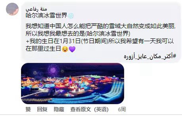 開(kāi)羅中國(guó)文化中心臉書(shū)主頁(yè)超級(jí)粉絲艾曼·索比、曼娜·伊薩姆和羅飛三位網(wǎng)友獲得了優(yōu)秀評(píng)論獎(jiǎng)。艾曼·索比在留言中提出想去黑龍江大慶泡雪地溫泉;曼娜·伊薩姆在評(píng)論里說(shuō)她想去哈爾濱極地公園游玩,想去牡丹江鏡泊湖的冰瀑跳水,想去吉林的查干湖看看;羅飛表示想到哈爾濱冰雪大世界去過(guò)生日。眾多網(wǎng)友也紛紛曬出了自己最想去的地方,新聞與媒體從業(yè)者加達(dá)·阿里想先去遼寧的滑雪場(chǎng),然后再去采摘丹東的草莓;來(lái)自明亞省的緒瑪·穆斯塔法表示想去內(nèi)蒙古東方冰雪小城阿爾山旅游;畢業(yè)于蘇哈格大學(xué)的薩蒙·瓦赫想去北京看奧林匹克塔等。網(wǎng)友們各抒己見(jiàn),暢想去中國(guó)的夢(mèng)幻旅程。