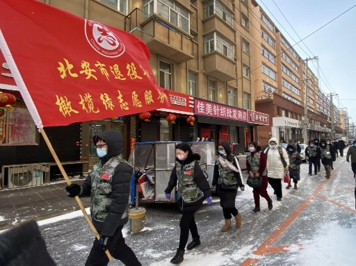 在北安,一走進(jìn)北安步行街,首先映入眼簾的是身著迷彩馬甲的退役軍人志愿者們,向沒佩戴口罩的市民免費(fèi)發(fā)放口罩,并主動宣傳疫情防控知識;頂著寒風(fēng),將步行街內(nèi)的積雪清理干凈,方便了市民的通行;幫助社區(qū)居民正確分類處置各類生活垃圾。這是北安市退役軍人服務(wù)中心、“橄欖綠”退役軍人志愿者服務(wù)隊正在踐行著幸福北安,文明有我。
