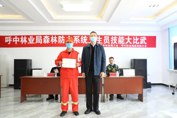 呼中林業(yè)局黨委書記魯智勇為“大比武”一等獎頒獎(孫樹輝 攝)