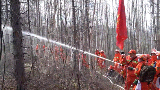 鏡頭三:整裝待發(fā)的森林消防隊(duì)員立刻展開行動(dòng),以最快的速度、最短的時(shí)間,到達(dá)模擬“火場(chǎng)”。他們兵分兩路,以水滅火隊(duì)員向模擬“火場(chǎng)”鋪設(shè)水帶、放置儲(chǔ)水袋,穩(wěn)定高壓水泵,并迅速將水噴射到模擬火點(diǎn)周圍。另一路伴隨著風(fēng)力滅火機(jī)械的轟鳴聲不斷向“火場(chǎng)”縱深推進(jìn)……無人機(jī)實(shí)時(shí)反饋火場(chǎng)信息保證火災(zāi)撲救安全。