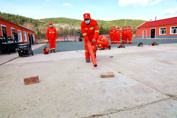 阿木爾林業(yè)局綠林林場專業(yè)撲火隊員在進(jìn)行風(fēng)力滅火機(jī)、油鋸的拆裝維修使用比賽(王力 攝)