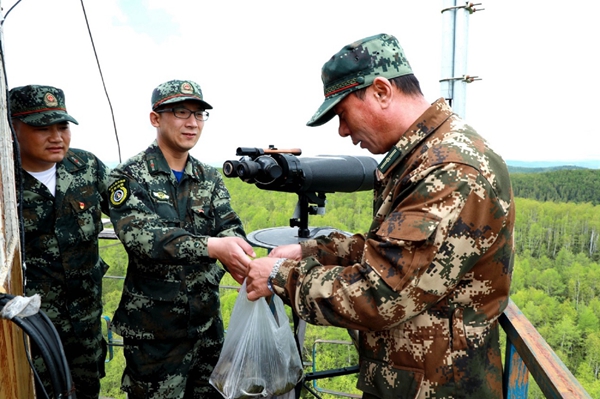 阿木爾林業(yè)局紅旗林場黨員干部在端午節(jié)這天把職工包的粽子送到“阿08”瞭望塔瞭望員鄭巖(右一)手中(王力 攝)