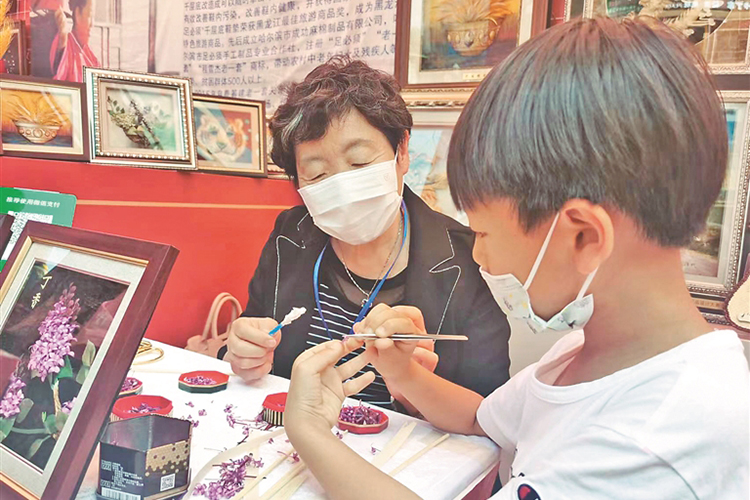 國(guó)家級(jí)非遺項(xiàng)目——麥稈剪貼技藝傳承人馬文俠教孩子制作紫丁香。黑龍江日?qǐng)?bào)全媒體記者 荊天旭攝