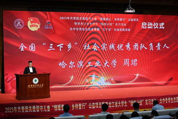本次活動(dòng),在哈爾濱商業(yè)大學(xué)的大力支持下順利開(kāi)展,哈爾濱商業(yè)大學(xué)副校長(zhǎng)姜國(guó)鋒在儀式上致辭,他說(shuō):“學(xué)校建校71年來(lái),立足立德樹(shù)人根本任務(wù),聚焦‘為黨育人,為國(guó)育才’的職責(zé)使命,在不斷加強(qiáng)‘第一課堂’建設(shè)的同時(shí),還依托學(xué)?!惑w兩翼’文化育人模式,充分發(fā)揮實(shí)踐育人的作用,通過(guò)開(kāi)展‘三下鄉(xiāng)’‘返家鄉(xiāng)’等社會(huì)實(shí)踐和‘西部計(jì)劃’‘興邊富民’志愿服務(wù)項(xiàng)目,引導(dǎo)廣大青年學(xué)生堅(jiān)持用習(xí)近平新時(shí)代中國(guó)特色社會(huì)主義思想凝心鑄魂,在社會(huì)的課堂中‘受教育、長(zhǎng)才干、作貢獻(xiàn)’?!被顒?dòng)現(xiàn)場(chǎng),播放《黑龍江省希望工程30年與光同行》和黑龍江省大中專學(xué)生志愿者暑期“三下鄉(xiāng)”社會(huì)實(shí)踐活動(dòng)宣傳片,與會(huì)領(lǐng)導(dǎo)上臺(tái)共同啟動(dòng)了“情暖童心·鄉(xiāng)伴童行”公益項(xiàng)目、大學(xué)生“揚(yáng)帆計(jì)劃”實(shí)習(xí)活動(dòng)、大中專學(xué)生志愿者暑期“三下鄉(xiāng)”社會(huì)實(shí)踐活動(dòng)。