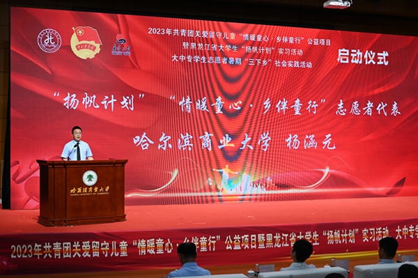 黑龍江經(jīng)濟(jì)網(wǎng)訊(王丹陽(yáng) 記者祝東)7月5日,2023年共青團(tuán)關(guān)愛(ài)留守兒童“情暖童心·鄉(xiāng)伴童行”公益項(xiàng)目暨黑龍江省大學(xué)生“揚(yáng)帆計(jì)劃”實(shí)習(xí)活動(dòng)、大中專學(xué)生志愿者暑期“三下鄉(xiāng)”社會(huì)實(shí)踐活動(dòng)啟動(dòng)儀式在哈爾濱商業(yè)大學(xué)隆重舉行。共青團(tuán)黑龍江省委副書(shū)記代東力、陳海平,哈爾濱商業(yè)大學(xué)副校長(zhǎng)姜國(guó)峰,省直機(jī)關(guān)團(tuán)工委書(shū)記趙明瑞,黑龍江省人力資源和社會(huì)保障廳、省知識(shí)產(chǎn)權(quán)局、省人民檢察院、省青少年發(fā)展基金會(huì)、哈爾濱市南崗區(qū)民政局、哈爾濱海關(guān)、哈爾濱海事局相關(guān)領(lǐng)導(dǎo),以及哈爾濱商業(yè)大學(xué)的志愿者和哈爾濱市樂(lè)業(yè)小學(xué)師生代表參加本次活動(dòng)。