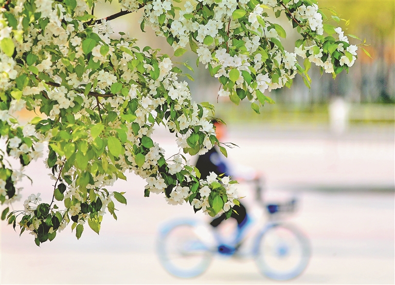 “五一”期間市區(qū)內(nèi)陸續(xù)投放的共享單車,為人們賞花提供了便利。