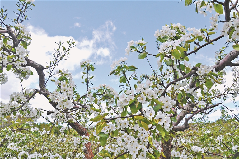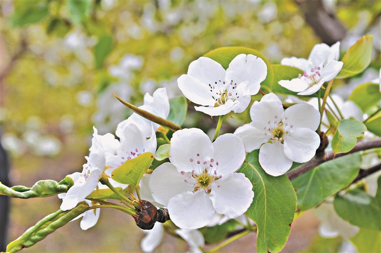 一場(chǎng)小雨過(guò)后,花瓣上、樹(shù)葉上一滴滴晶瑩剔透的水珠給梨樹(shù)增添了幾分韻味,梨花帶雨,讓人又憐又喜。漫步梨園,樹(shù)上朵朵梨花如雪,地面蒲公英花金黃,頭頂是湛藍(lán)的天空和朵朵白云,一只只繁忙的小蜜蜂在花間“起舞”。漫步其中,仿佛游走于一幅畫卷中,讓人只想留住這美麗的瞬間。