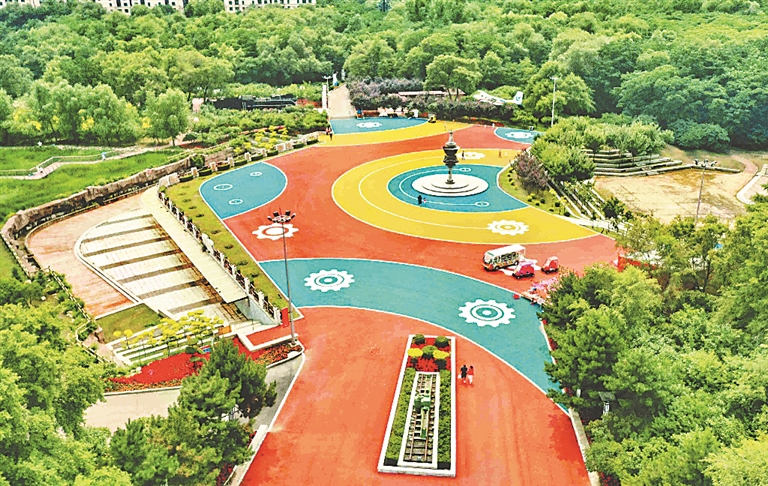 公園內(nèi)4000多平方米的休閑廣場(chǎng),經(jīng)過改造、彩化,呈現(xiàn)出全新的面貌,孩子們?cè)谏厦骝T車、奔跑。彩色廣場(chǎng)將工業(yè)主題元素融入設(shè)計(jì)理念,與周圍的景觀小品相得益彰。
