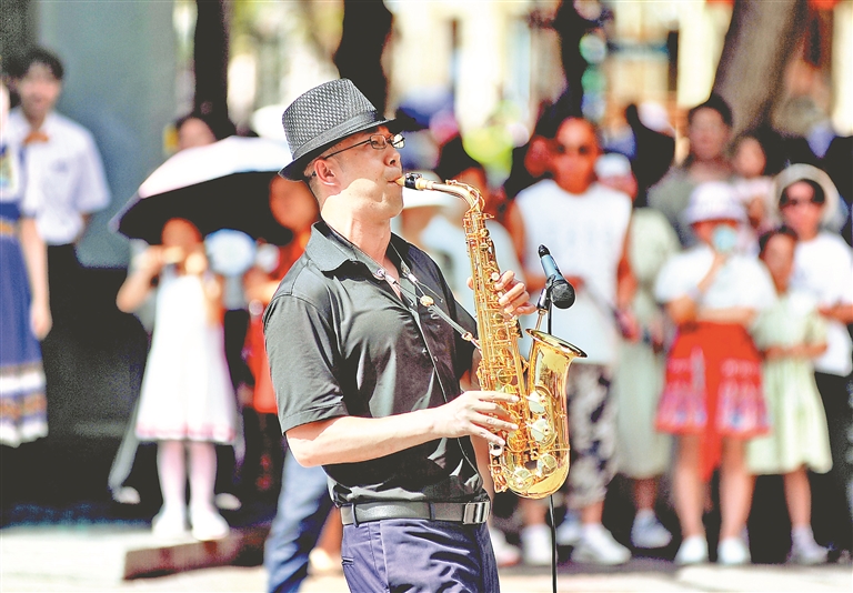 日前,哈爾濱市道里區(qū)中央大街與紅專街交口處,多位藝術(shù)家現(xiàn)場(chǎng)為人們表演,吸引許多游客圍觀。琵琶、薩克斯、手風(fēng)琴等樂器演奏的經(jīng)典樂曲,博得人們陣陣掌聲。美妙的旋律回蕩在街道上空,為百年老街增添了更多的藝術(shù)魅力。