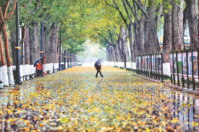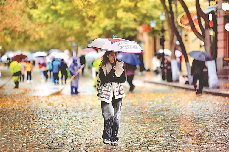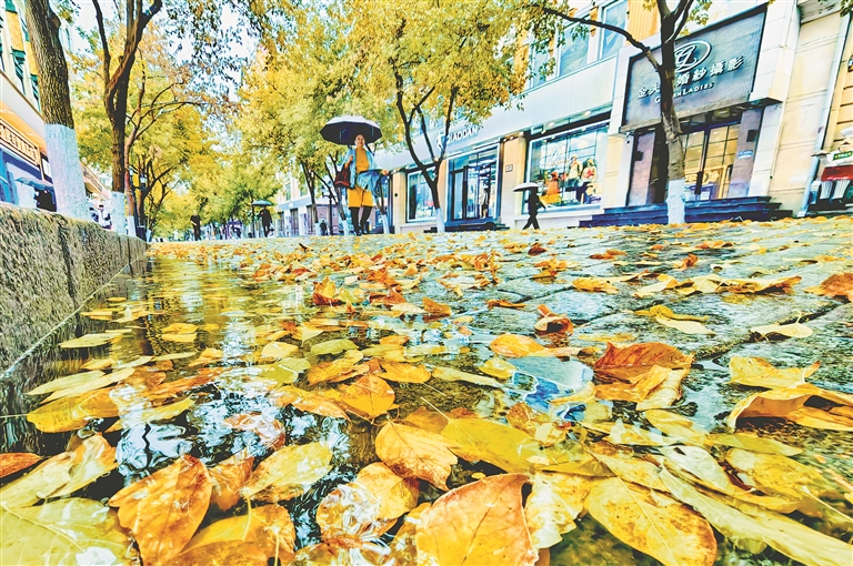 雨中秋意濃。10日一場(chǎng)秋雨,哈爾濱街道兩側(cè)的樹葉紛紛飄落,滿地落葉如同一層金色地毯,為秋日冰城增添了更多魅力。外出的人們撐起五顏六色的雨傘,走在落葉間,構(gòu)成了一幅幅美麗的油畫。