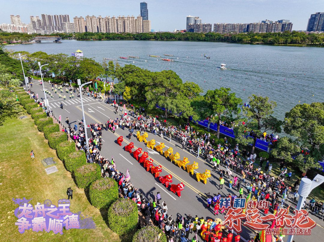 桂畔湖上觀競渡,順峰山下接龍福。12月8日,陽光明媚,天朗氣清,水上,來自全國各地的龍舟勁旅齊聚順德,展開水上競逐;岸邊,薈萃順德十鎮(zhèn)街龍文化元素的“文化巨龍”,開啟4.5公里的精彩巡游。