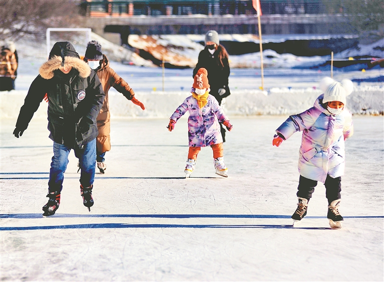 近日,哈爾濱市道里區(qū)群力體育公園公益冰場內,許多人在練習滑冰。