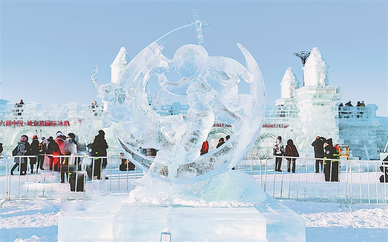 本屆比賽吸引了來自中、俄、美、法等12個(gè)國家的30支冰雕隊(duì)參賽?!毒聿赝ぁ芬詢和笾獮橹黝},用幼童勤奮讀書、與書為友的畫面,刻畫出其對知識的渴望。本報(bào)記者 郭俊峰攝