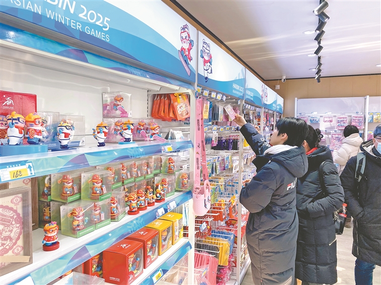 在哈爾濱市中央大街和道外區(qū)中華巴洛克歷史文化街區(qū)等處的亞冬會特許商品經(jīng)銷店內(nèi),游客和市民將柜臺圍得水泄不通,挑選各種款式的“濱濱”“妮妮”。