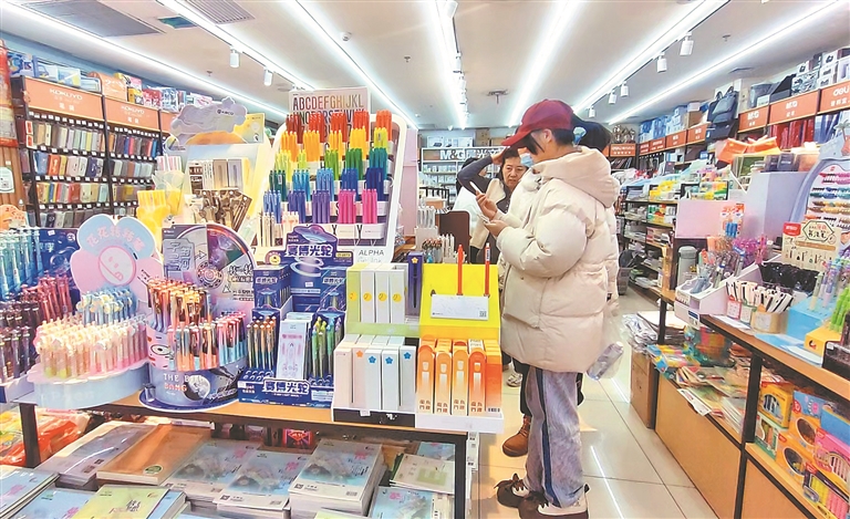 在文教用品專(zhuān)柜里,各種筆記本、款式新穎的筆、不同顏色的文具盒、書(shū)包等琳瑯滿目,應(yīng)有盡有。銷(xiāo)售人員介紹,新學(xué)期即將開(kāi)始,文具的銷(xiāo)售量持續(xù)增多。家長(zhǎng)為孩子挑選文具時(shí),更傾向于選擇環(huán)保的產(chǎn)品。