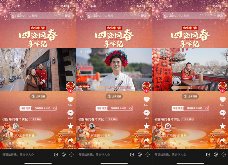 為紀(jì)念首個(gè)“非遺版春節(jié)”,由抖音出品、中國(guó)名酒劍南春冠名的春節(jié)主題紀(jì)錄片《四海同春年味紀(jì)》邀請(qǐng)多位明星來到家鄉(xiāng)或向往的城市,體驗(yàn)當(dāng)?shù)靥厣晡?。紀(jì)錄片于1月22日-1月27日,通過抖音、抖音精選、今日頭條、西瓜視頻、鮮時(shí)光等平臺(tái)播出。截至收官,該片正片播放量超1億,抖音話題播放量破2.3億,全網(wǎng)曝光達(dá)10億,相關(guān)話題多次登上平臺(tái)熱榜。
