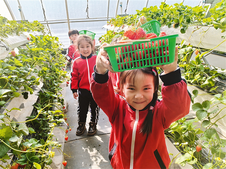 在位于陽(yáng)明區(qū)樺林鎮(zhèn)的唐櫻園生態(tài)農(nóng)場(chǎng)里,整齊排列著24棟智能溫室大棚。在11號(hào)草莓大棚里,來自同心幼兒園的小朋友正在采摘草莓,孩子們興奮地圍著草莓觀察,“草莓真好看,草莓好甜啊!”