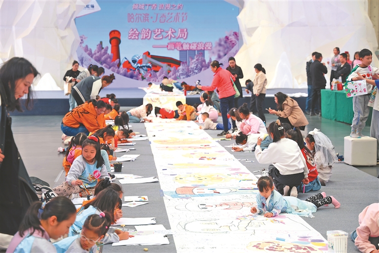 1日,“傾城丁香·浪漫之約”2025哈爾濱丁香藝術(shù)周在西城紅場(chǎng)美術(shù)館啟幕。圖為少兒丁香主題繪畫(huà)活動(dòng)。