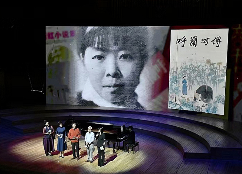 第一篇章《松花江上》以《長城謠》的泣血鄉(xiāng)愁與《義勇軍進行曲》的全場肅立高唱,訴盡抗戰(zhàn)時期的流亡之痛與民族豪情,更創(chuàng)新植入“童年、少女、青年”三代“蕭紅”扮演者(張舒涵、鄭楚琪、尤泓斐)與合唱團的情景互動。第二篇章《抗戰(zhàn)的烽火》中,《五月的鮮花》《露營之歌》《保衛(wèi)黃河》等作品以合唱與立體站位,緬懷趙一曼、楊靖宇等英烈,再現(xiàn)全民抗戰(zhàn)的壯闊圖景。第三篇章《文脈永續(xù)》則通過魯迅、茅盾等文學名家對蕭紅的評價、跨年代讀者代表致敬及《致祖國》的磅礴合唱,彰顯其文學精神在新時代的傳承。