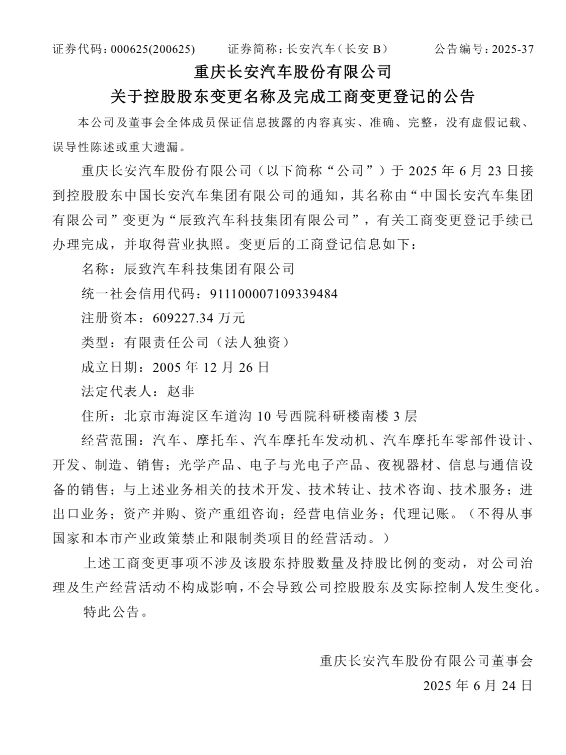 6月23日晚間,重慶長(zhǎng)安汽車(chē)股份有限公司(以下簡(jiǎn)稱(chēng)“長(zhǎng)安汽車(chē)”;000625)發(fā)布公告稱(chēng),公司接到控股股東中國(guó)長(zhǎng)安汽車(chē)集團(tuán)有限公司通知,其名稱(chēng)由“中國(guó)長(zhǎng)安汽車(chē)集團(tuán)有限公司”變更為“辰致汽車(chē)科技集團(tuán)有限公司”,并已完成工商變更登記手續(xù)。