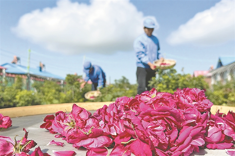 “清晨的玫瑰花帶著露水,香氣最濃,品質(zhì)也是最好的。”說話的是采摘工人馬鳳華,她手法嫻熟,一邊將飽滿嬌艷的玫瑰花朵輕輕摘下放入竹籃,一邊介紹。馬鳳華和另外兩名工人穿梭在百畝玫瑰種植地中,玫瑰花瓣上晶瑩的露珠沾濕了她們的褲腳,她們的身影與綻放的玫瑰,構(gòu)成了一幅美麗的田園畫卷。