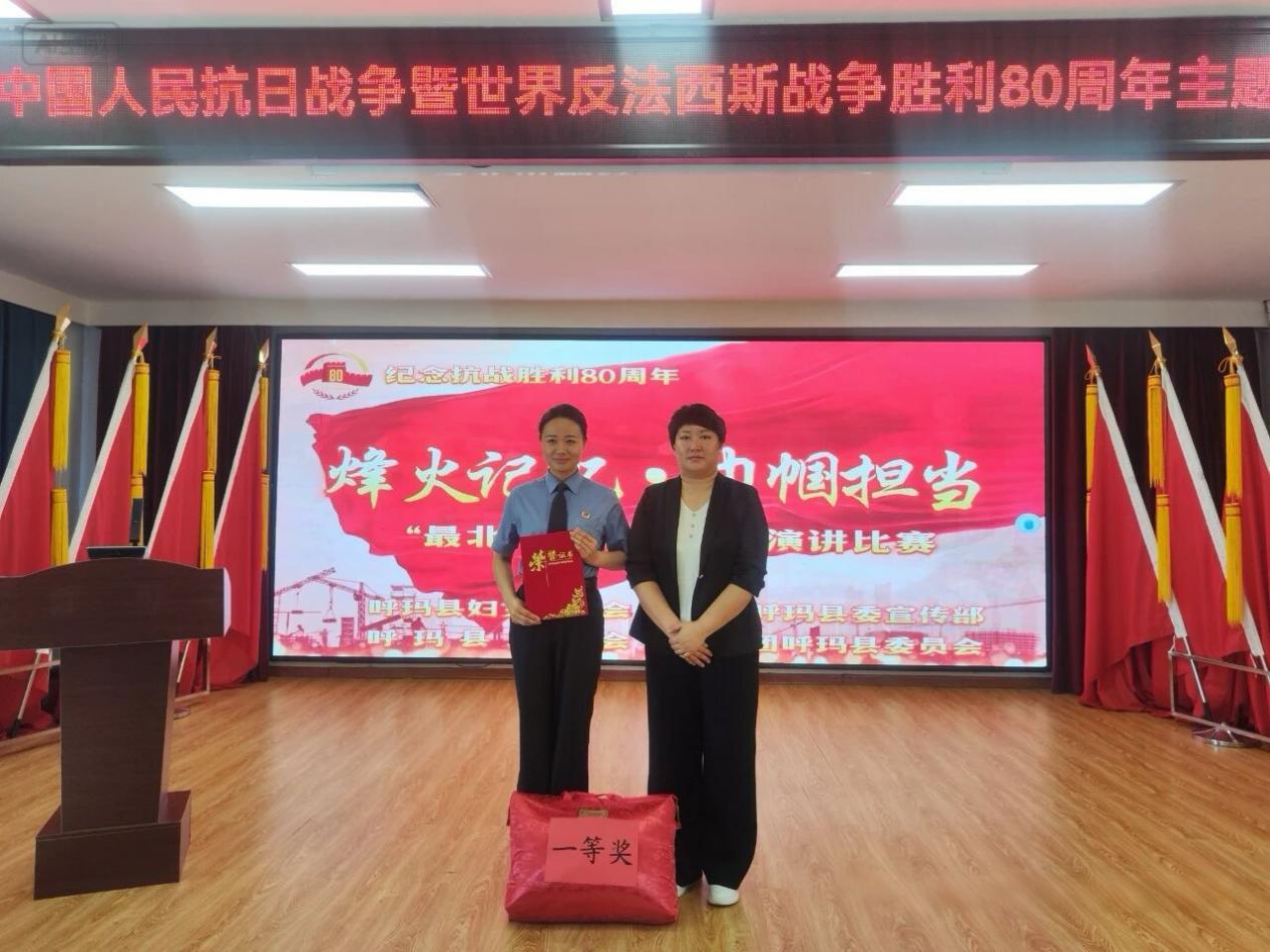 經(jīng)過(guò)緊張激烈的預(yù)賽,呼瑪縣人民檢察院干警郭海萍脫穎而出進(jìn)入總決賽。決賽現(xiàn)場(chǎng),各位選手緊扣主題,立足崗位,以真摯的情感和激昂的語(yǔ)言,生動(dòng)展現(xiàn)了新時(shí)代巾幗風(fēng)采。她們深情回顧艱苦卓絕的抗戰(zhàn)歲月,弘揚(yáng)革命先輩為國(guó)獻(xiàn)身的偉大精神;結(jié)合當(dāng)下,暢談抗戰(zhàn)精神的時(shí)代傳承;展望未來(lái),激勵(lì)廣大女性在新征程上踔厲奮發(fā)、勇毅前行,充分彰顯了新時(shí)代女性的使命與擔(dān)當(dāng)。經(jīng)過(guò)激烈角逐,最終,郭海萍榮獲一等獎(jiǎng)。