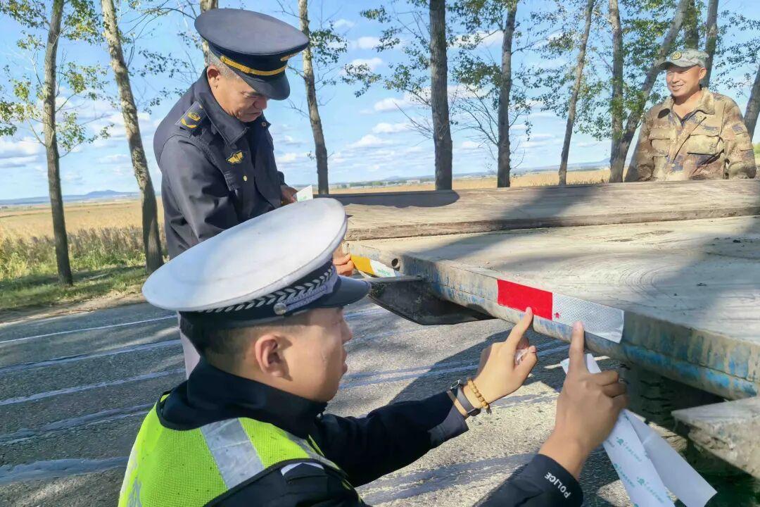 行動(dòng)中,“警農(nóng)”聯(lián)合執(zhí)法小組結(jié)合轄區(qū)秋收農(nóng)機(jī)出行規(guī)律,在農(nóng)村主干道、田間出入口等路段設(shè)置臨時(shí)檢查點(diǎn),按照“逢車必查、違法必究”的原則,對(duì)過往拖拉機(jī)、農(nóng)用車進(jìn)行逐一檢查,嚴(yán)厲打擊無牌無證、酒駕醉駕、違法載人等交通違法行為,形成嚴(yán)查、嚴(yán)管、嚴(yán)處的高壓態(tài)勢(shì),從源頭上預(yù)防和減少交通事故。同時(shí),針對(duì)秋收期間農(nóng)用車、農(nóng)機(jī)具夜間作業(yè)頻繁,反光標(biāo)識(shí)缺失易引發(fā)事故的問題,持續(xù)深化“亮尾”行動(dòng),對(duì)上路行駛的農(nóng)用車、大型農(nóng)機(jī)具等車身無反光標(biāo)識(shí)、反光標(biāo)識(shí)不清晰不完整的車輛現(xiàn)場(chǎng)免費(fèi)粘貼反光貼,確保車身側(cè)面、尾部關(guān)鍵部位反光標(biāo)識(shí)清晰可見,提升夜間行駛辨識(shí)度;并向群眾面對(duì)面講解農(nóng)用車違法載人、無牌無證、駕駛報(bào)廢車輛上路行駛等交通違法行為的危害性,切實(shí)提升安全出行意識(shí)和自我保護(hù)意識(shí),引導(dǎo)群眾自覺遵守交通法規(guī),養(yǎng)成安全作業(yè)習(xí)慣。